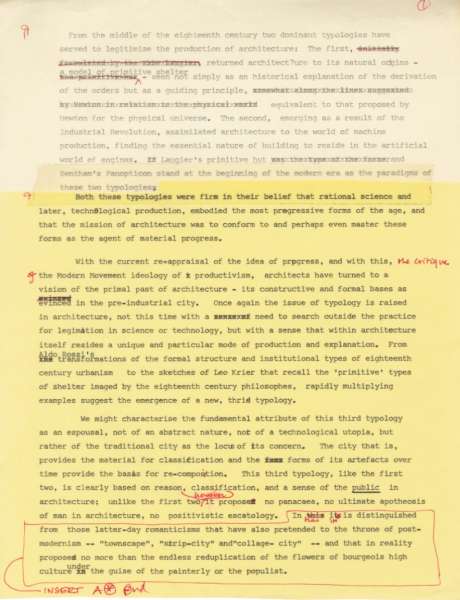 Anthony Vidler, first page of typescript of “The Third Typology,” 1977. Courtesy of Emily Apter.
